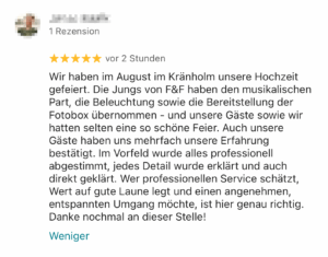 Auch mit unseren weiteren Extras wie z.B. Fotobox, Ambiente-Beleuchtung, Leuchtbuchstaben, Audio-Gästebuch, Außenlautsprecher, etc. kombinierbar.